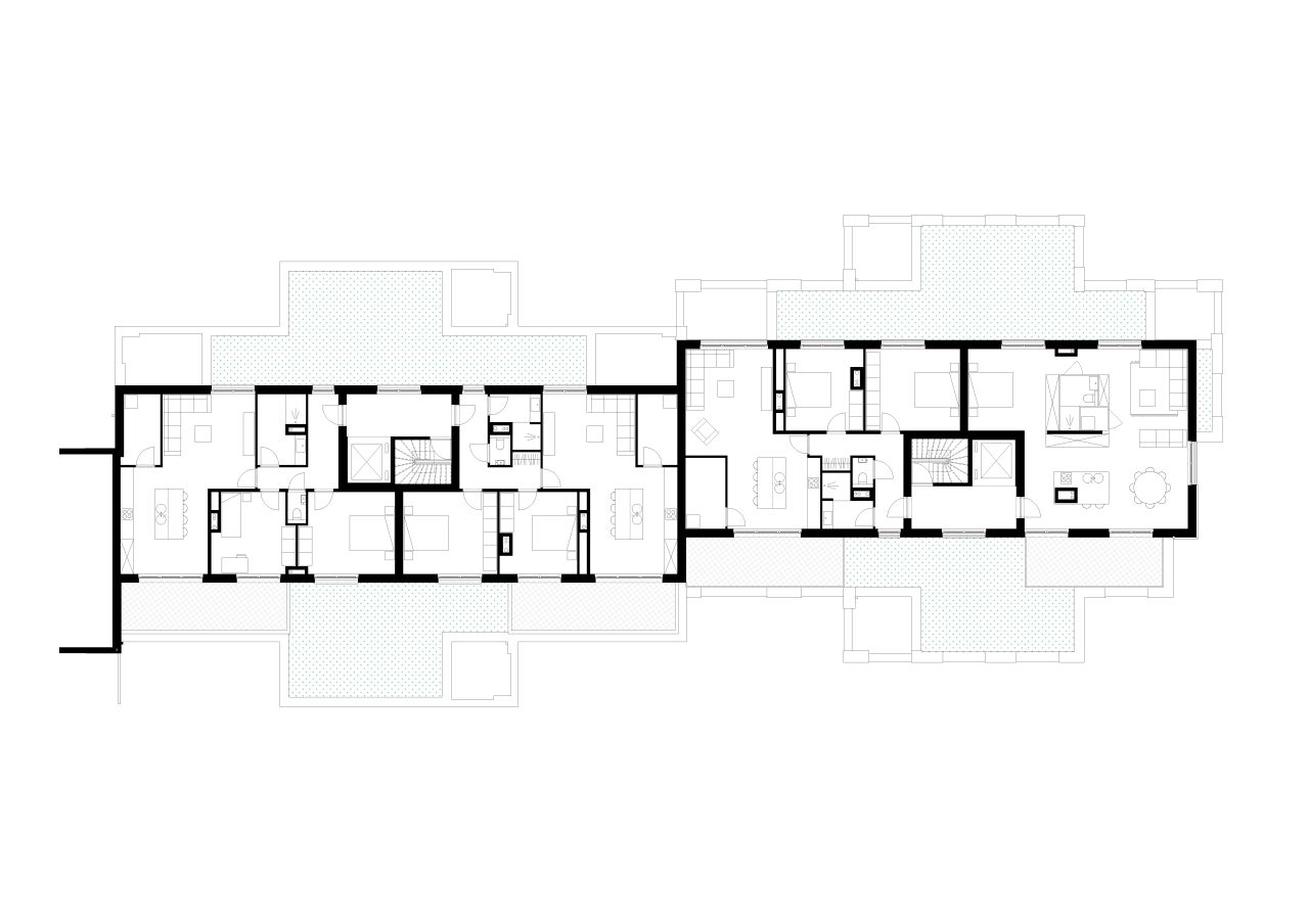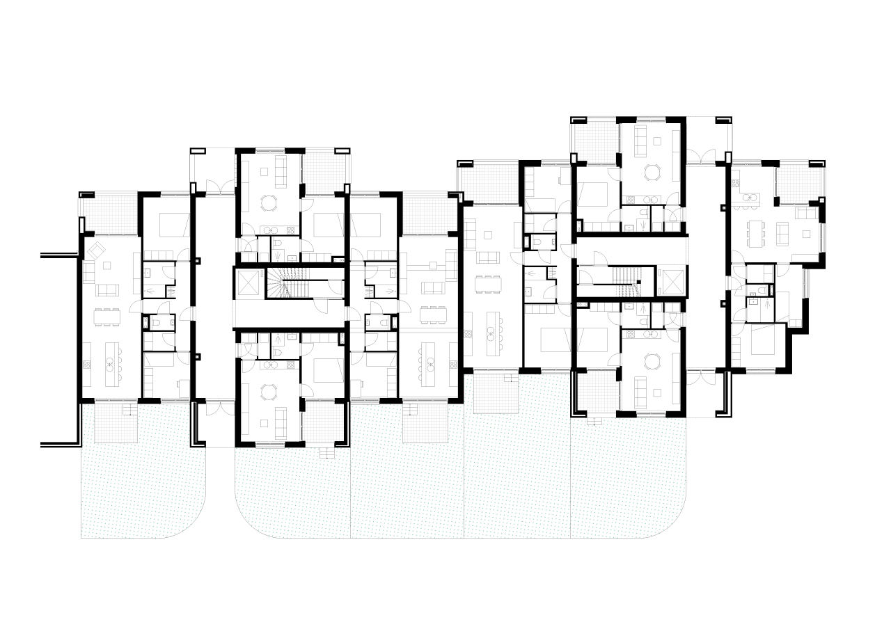 In totaal zijn er 36 nieuwe appartementen. De gebouwen hebben een type grondplan met 4 appartementen die kruisvormig geschikt zijn rond een centrale circulatiekern. Het schema is compact en rationeel, maar zorgt ook voor een levendig volumespel en variatie in appartementstypes. De meeste appartementen beschikken over een loggia met tweezijdig uitzicht.