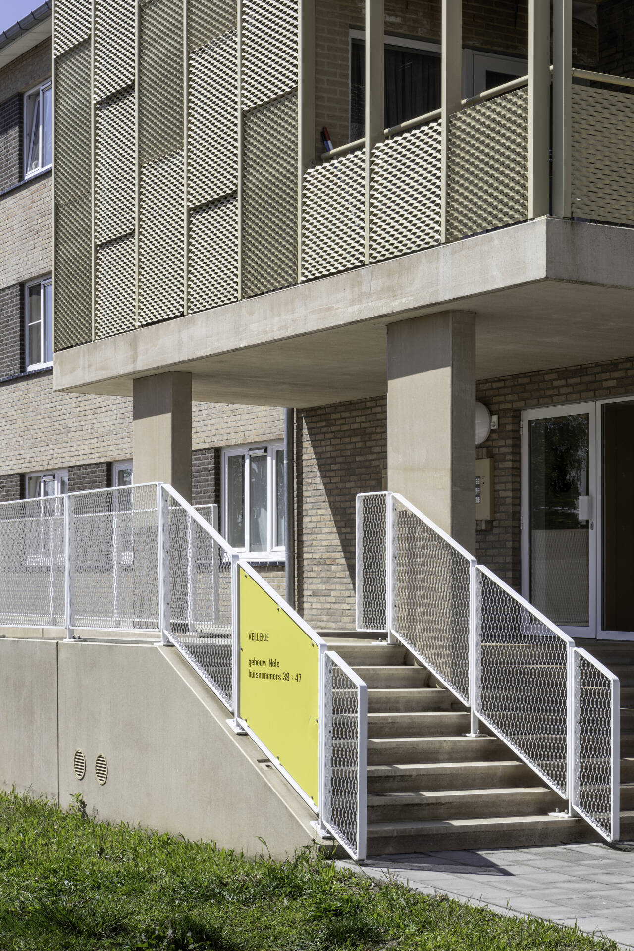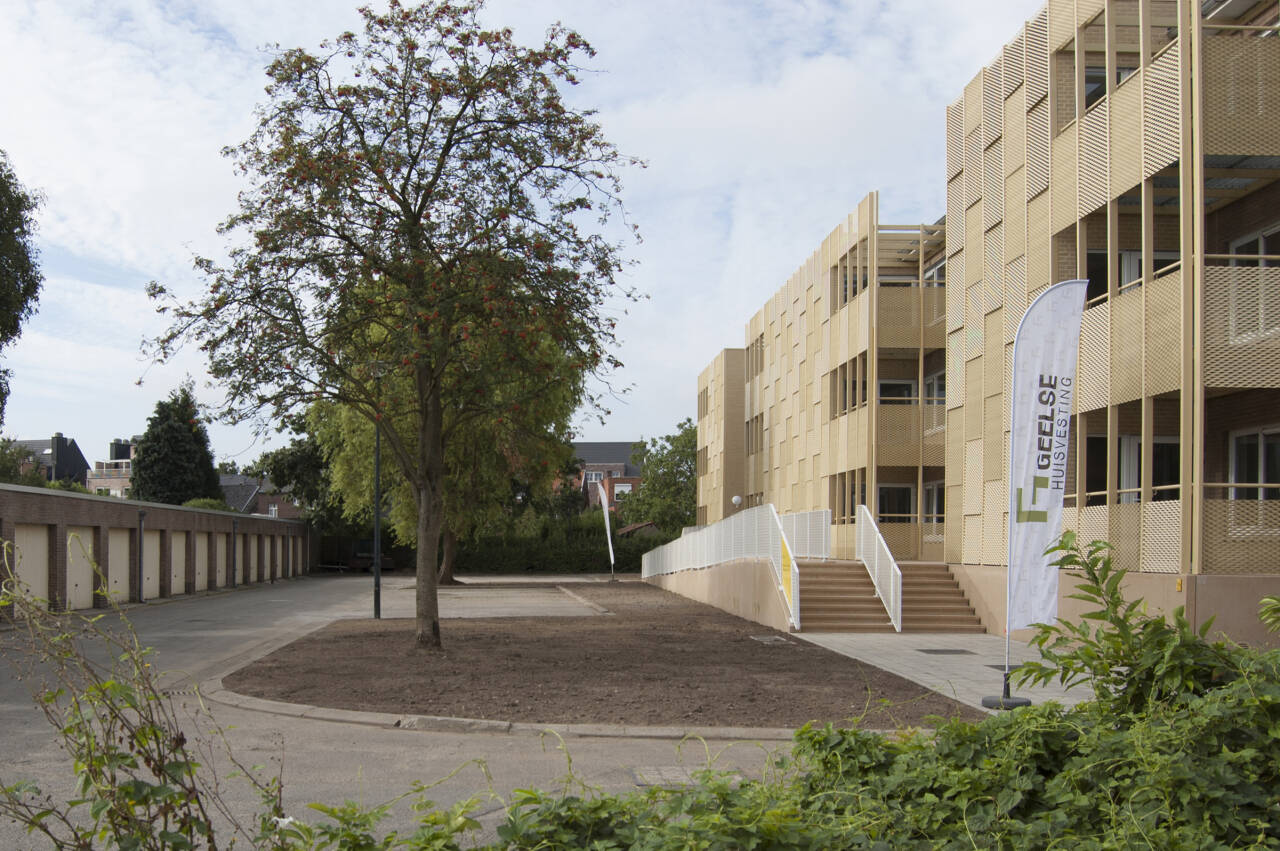 Drie bestaande woongebouwen van huisvestingsmaatschappij Geelse Huisvesting worden gestript tot op de ruwbouwstructuur. Een uitbreiding zorgt voor de nodige extra ruimte. De nieuwe terrassen zijn opgevat als een vrijstaande staalconstructie afgewerkt met semi doorzichtige panelen van gerekt metaal. Het trio krijgt nieuwe toegangspartijen met een fris uiterlijk waarbij trendy terrazzo vloertegels en de warmgele trapleuning in gebogen staalplaat allure geven aan de collectieve ruimtes. Enkele appartementen kunnen ‘op maat’ aangepast worden voor bewoners met een fysische beperking.