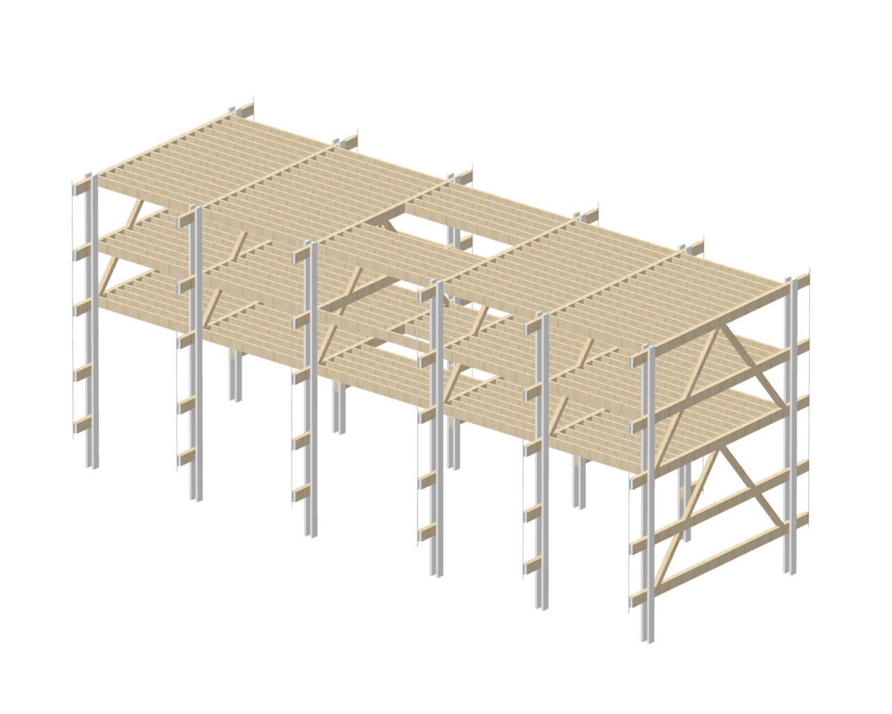 De uitbreiding is een zelfdragende, lichte structuur van staal en hout die over het ‘oude’ gebouw komt te staan. Zes A-spanten in gelamelleerd hout met een hoogte van 2 verdiepingen dragen de houten vloeren die opgebouwd zijn uit gelamelleerde houten balken. De balken worden constructief verbonden met een dunne, massieve plaat van kruislaags hout (CLT). Zo krijgen we een lichte structuur met kolomvrije binnenruimtes.